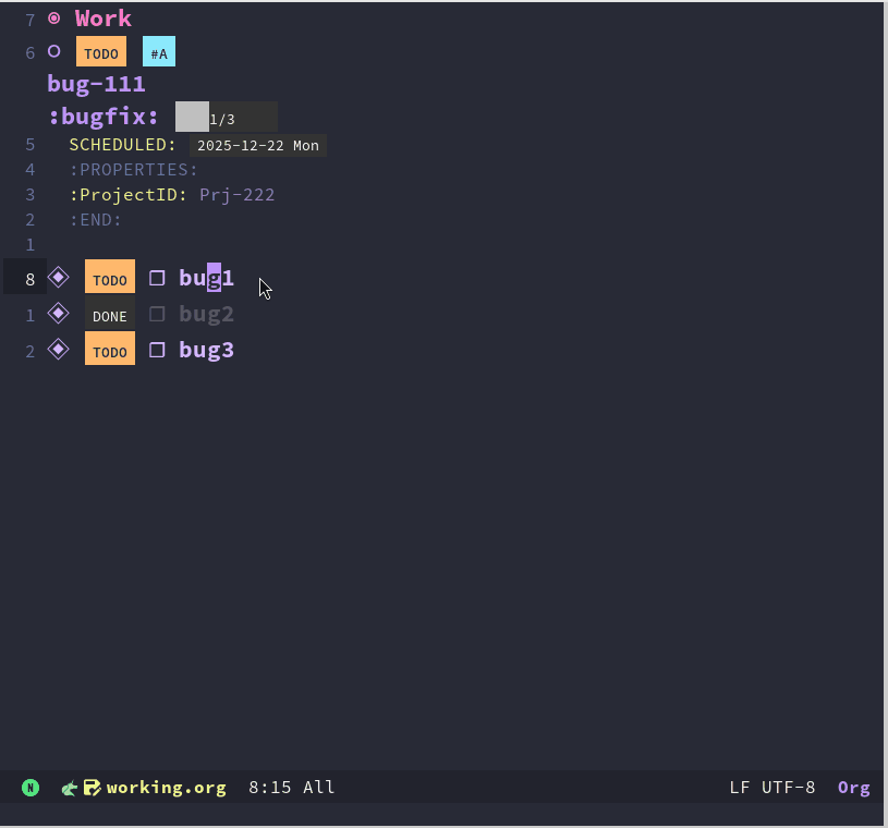 org mode 中对于子任务的表现比较简单。子任务就是任务下的一个次级的 headline。我们可以在主任务后面加上 [/] 或者 [%] 来根据子任务的完成情况自动更新主任务的完成进度