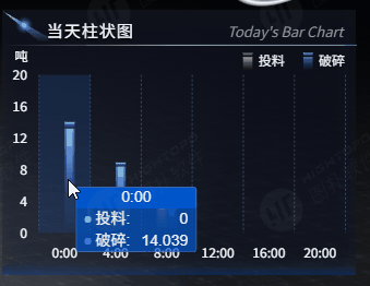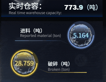 系统支持 2D 数据面板与 3D 场景深度嵌套叠加,面板涵盖当前行车位置、抓斗实时坐标、仓容动态数据、当日投炉物料重量、破碎处理量等核心指标,通过图扑 HT 丰富的图表组件直观呈现设备状态与作业统计 信息。同时支持历史数据回溯查询,满足多场景数据追溯需求。