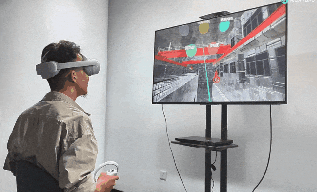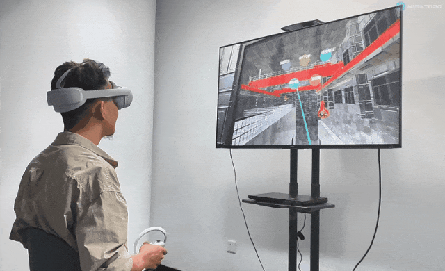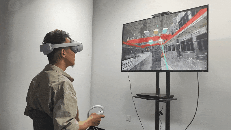 用户通过 VR 头显与操作手柄组合,可实现与行车吊操作面板的联动控制:佩戴设备后,视野将同步呈现 1:1 还原物理场景的 VR 设备模型及配套虚拟操作手柄,手柄投射的交互射线可精准响应虚拟环境操作,射线指向目标物体时自动触发预设自定义事件,实现沉浸式精准操控。