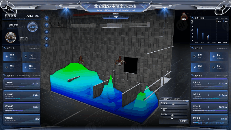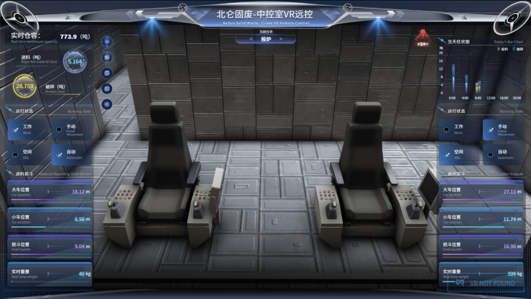 画面采用科幻风格中模设计,兼顾视觉真实性与系统轻量化运行。基于固废处理车间实际场景与设备参数,完整还原墙体、楼板,及两台行车吊的双梁大车、起重小车、抓斗,同时精准复刻控制室操作台、控制按钮组、定制化操作手柄等核心要素。