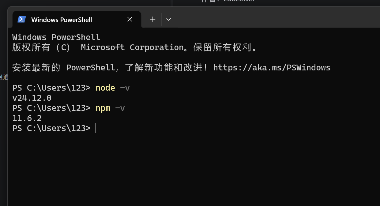 如果执行 npm -v 报错(系统禁止运行脚本),在 PowerShell 运行: