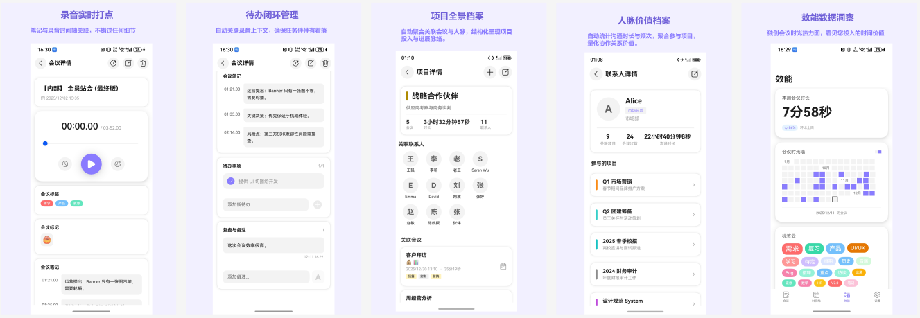 同理,人脉不该只是通讯录里冷冰冰的号码。在我的设计里,联系人是流动的资产。录音结束时,系统引导你关联参会人,这背后是一张复杂的多对多关系网。随着时间推移,这张网越来越密。点开合作伙伴头像,系统自动聚合你们所有的沟通记录、共同项目和累计协作时长。