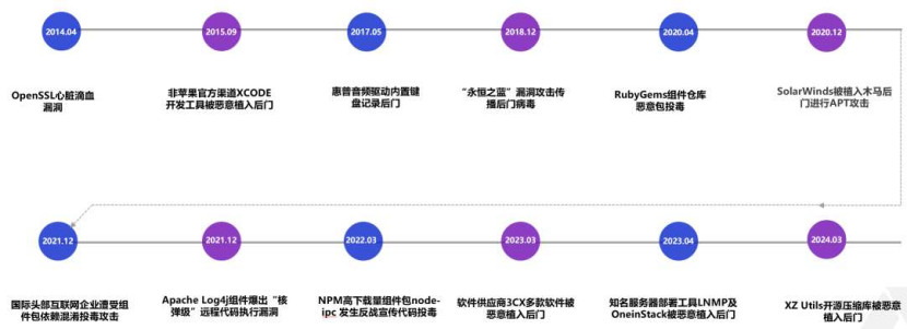 从2014年的OpenSSL心脏滴血漏洞,到2020年的SolarWinds供应链攻击,再到2023年的Log4j2漏洞、XZ事件......软件供应链安全事件频发,影响范围从底层组件延伸到上层应用,攻击手法从漏洞利用发展到代码投毒。
