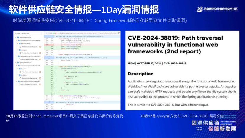 再比如 Spring Framework 的 CVE-2024-38819 漏洞,悬镜安全平台 10 月 15 日就监控到修复代码提交,而官方 10 月 17 日才发布漏洞公告,这两天的时间差,就是我们帮助企业提前防护的关键窗口。