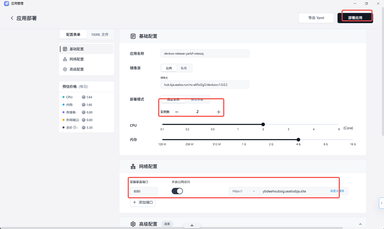 4.第四步:在应用管理中心,我只点击了几下就完成了应用的上线和公网域名分配。 版本发布成功后,页面自动跳转到应用管理。我只需要设置实例数量、暴露端口,并开启外网访问。Sealos 就会自动为我分配一个公网域名,并处理好 HTTPS 证书。点击"部署应用",几分钟后,我的服务就可以通过域名直接访问了。