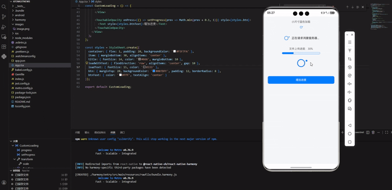 React Native 在 OpenHarmony 平台中,支持全维度的加载效果定制,除了基础的环形加载,还能实现进度条加载、文字 + 加载组合、自定义尺寸颜色、全屏加载等高阶形态,所有样式均支持鸿蒙全版本适配,无兼容性问题。核心方案为:基于原生组件扩展 + 样式层深度定制,无需依赖任何三方加载库,轻量化且性能优异。