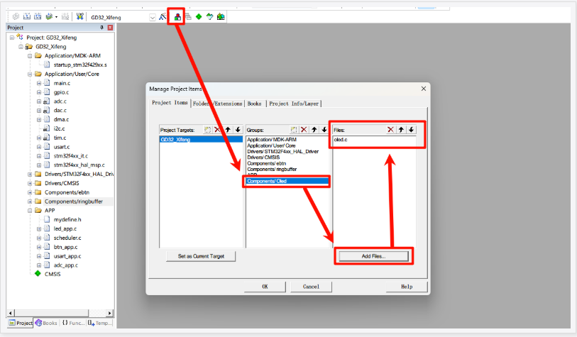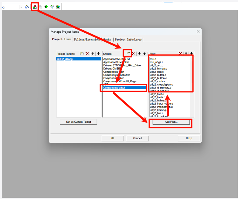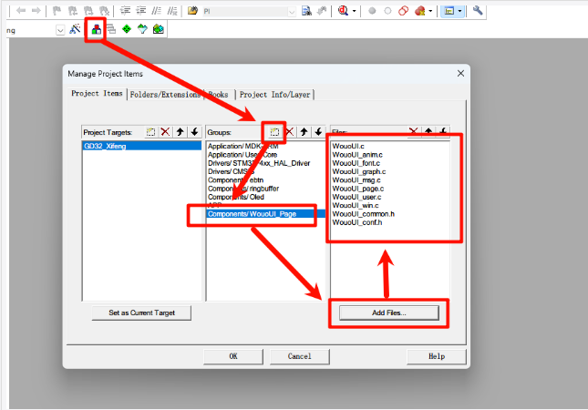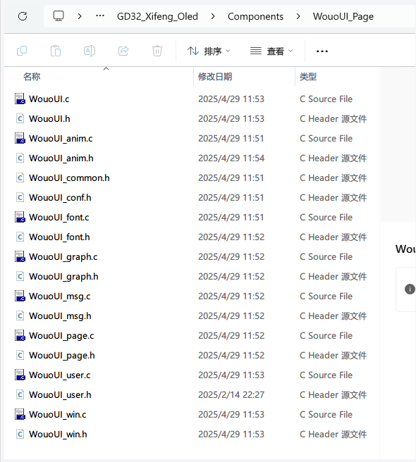 解决命名冲突 (如果需要): 参考文档提到,如果基础 OLED 驱动 (`oled.c`, `oledfont.h`) 中有与 WouoUI 库(或其依赖的库)冲突的名称(例如 `F8X16` 字体),需要重命名其中一个以解决冲突。例如,将驱动中的 `F8X16` 改为 `Oled_F8X16`。