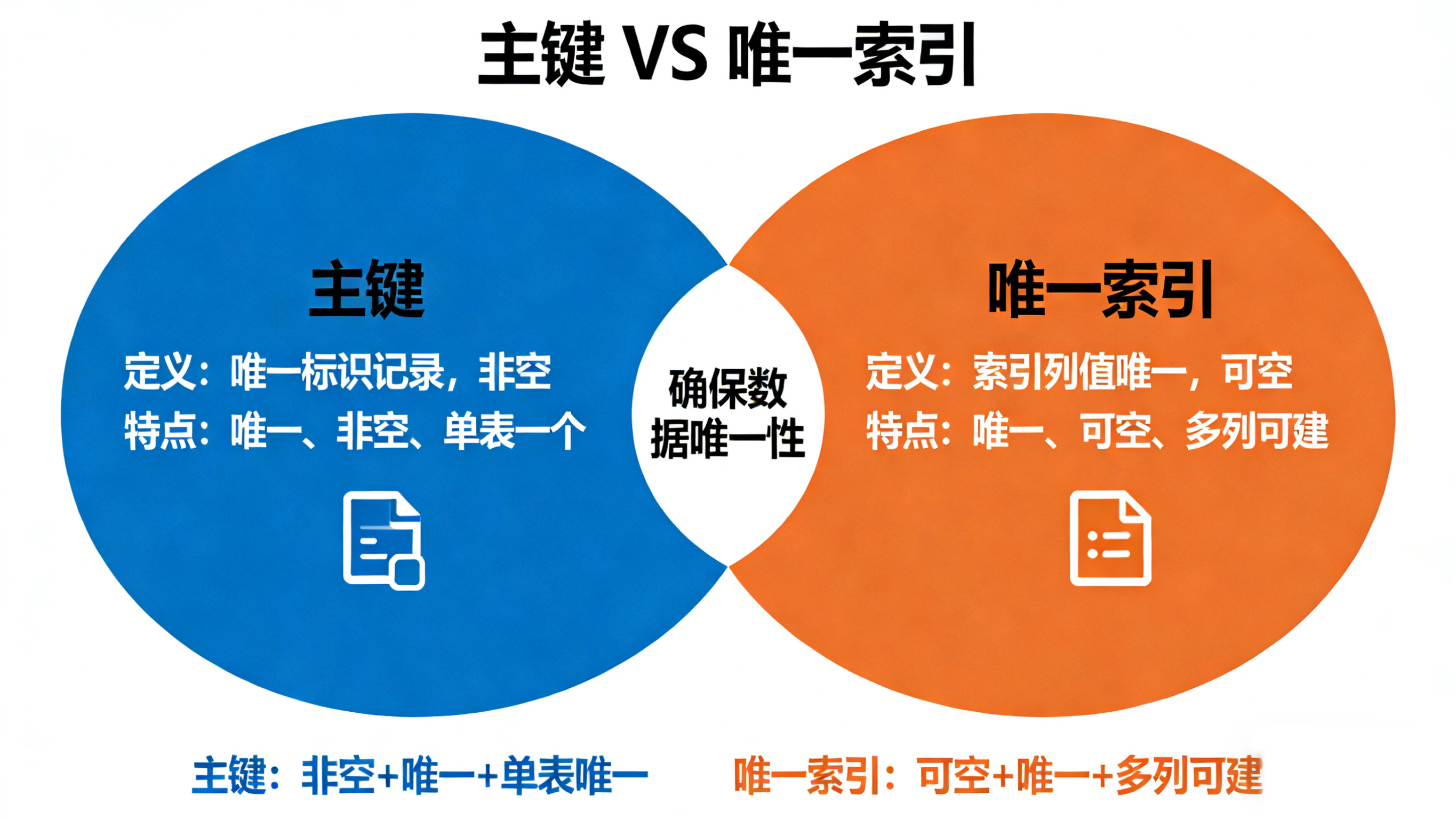 主键与唯一索引的核心差异在于"身份定位":主键是表的"唯一身份证",承担数据标识和关联核心职责,具备严格的非空和数量限制,默认对应高效的聚簇索引;唯一索引是"唯一性校验标签",用于辅助业务规则约束和查询优化,允许空值、支持多索引创建,默认对应非聚簇索引。