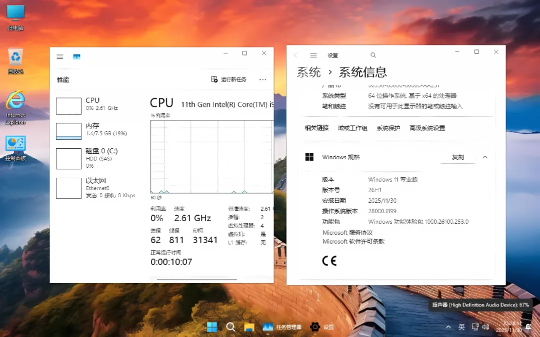 系统简洁纯净,安装后进程 仅为62 、线程811 、句柄31341 !通过实测对比发现:26H1 比 24H2 和 25H2 流畅许多!