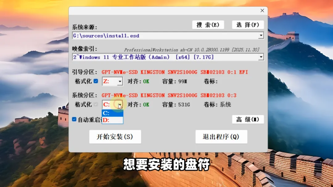 设定想要安装的盘符 ,可以是本地硬盘 或者移动硬盘: