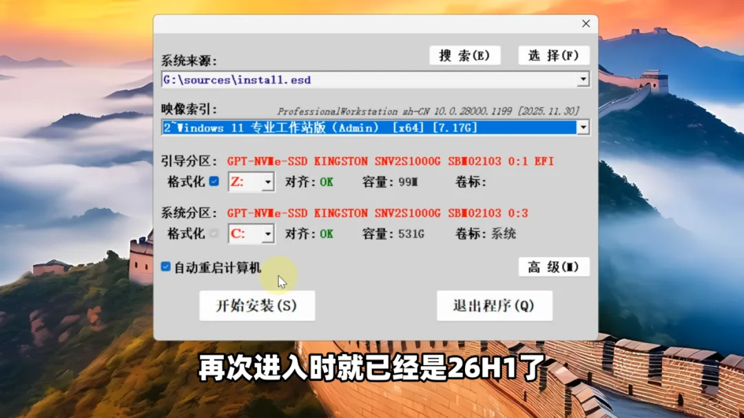 安装完成后,会自动重启 ,再次进入时,就已经是26H1了,非常简单: