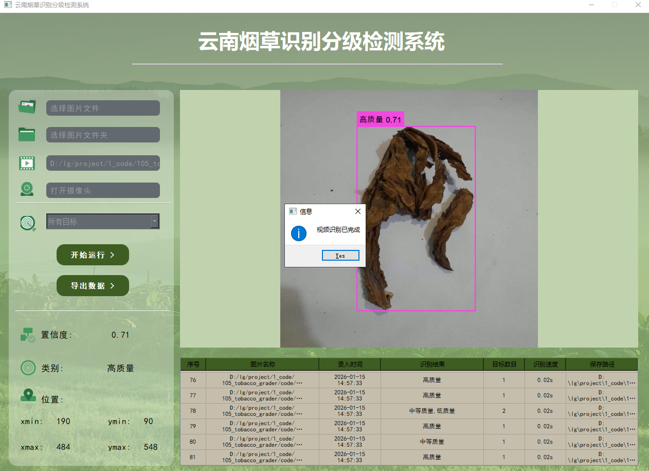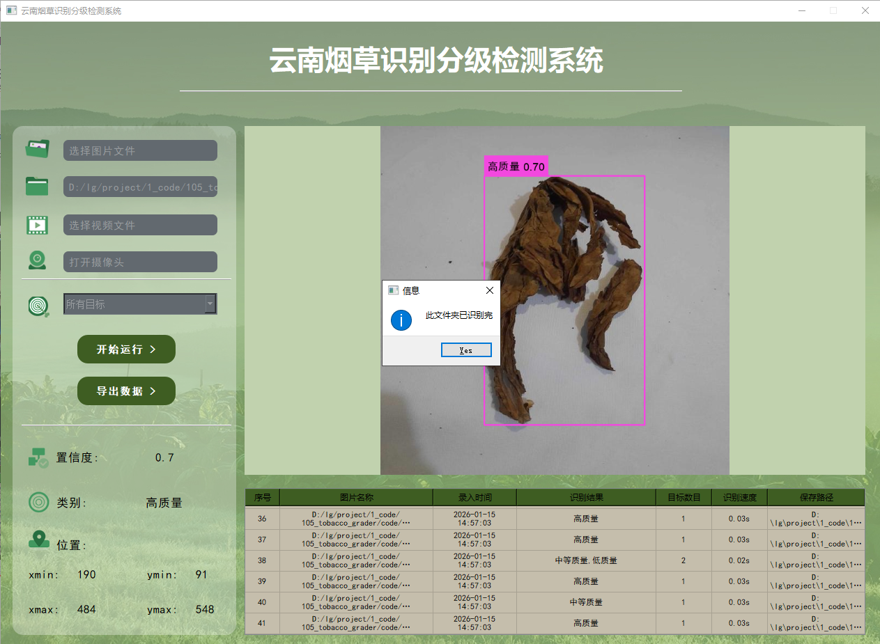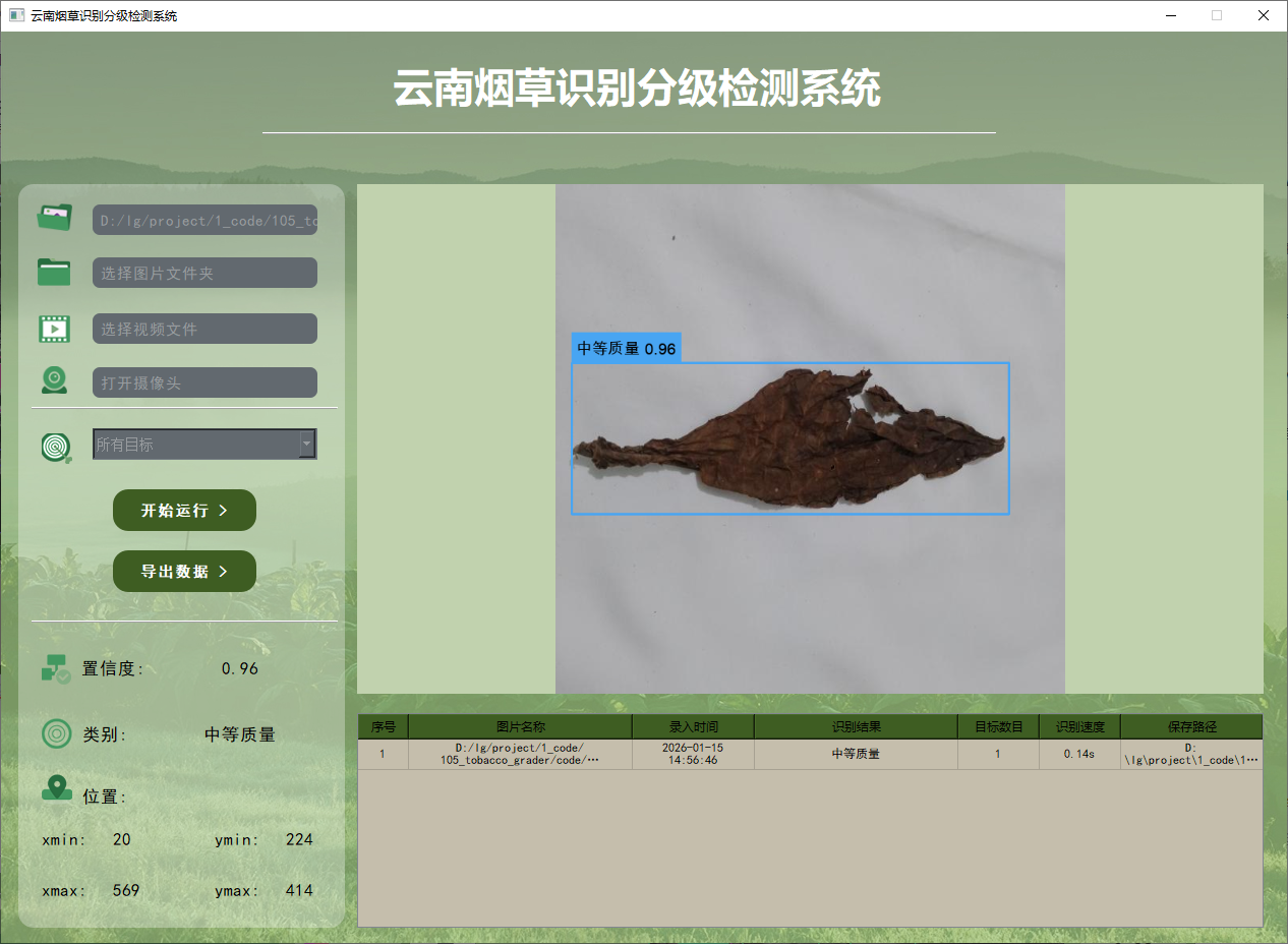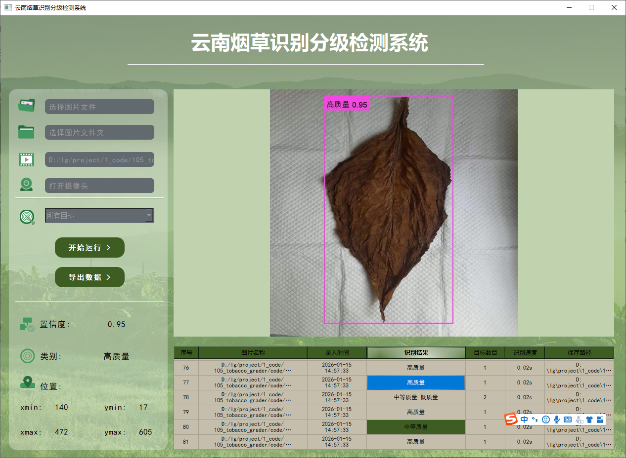 此外,我们开发了一款带有UI界面的烟草识别分级识别系统,支持实时检测烟草,并能够直观地展示检测结果。系统采用Python与PyQt5开发,可以对图片、视频及摄像头输入进行目标检测,同时支持检测结果的保存。本文还提供了完整的Python代码和详细的使用指南,供有兴趣的读者学习参考。获取完整代码资源,请参见文章末尾。