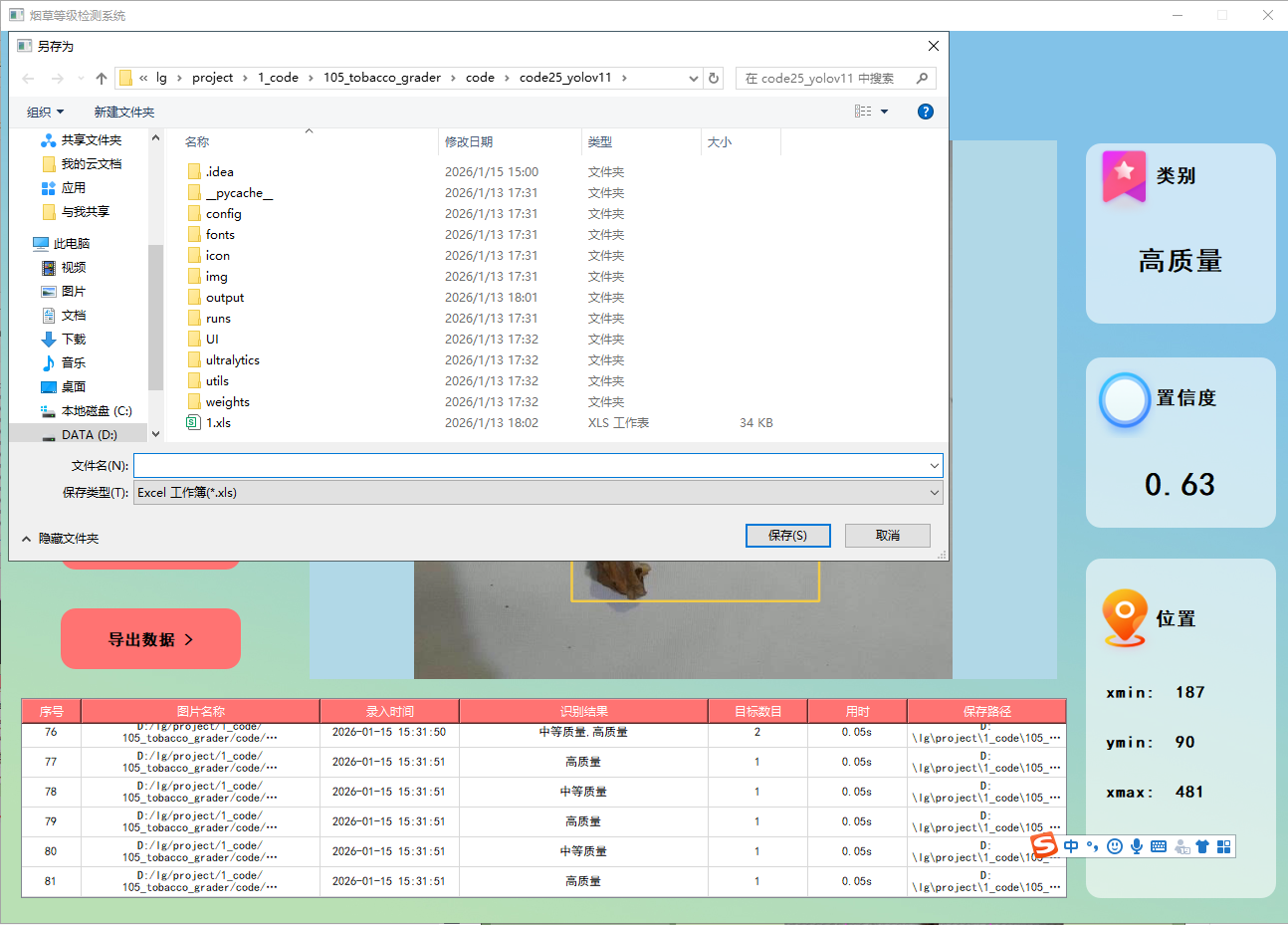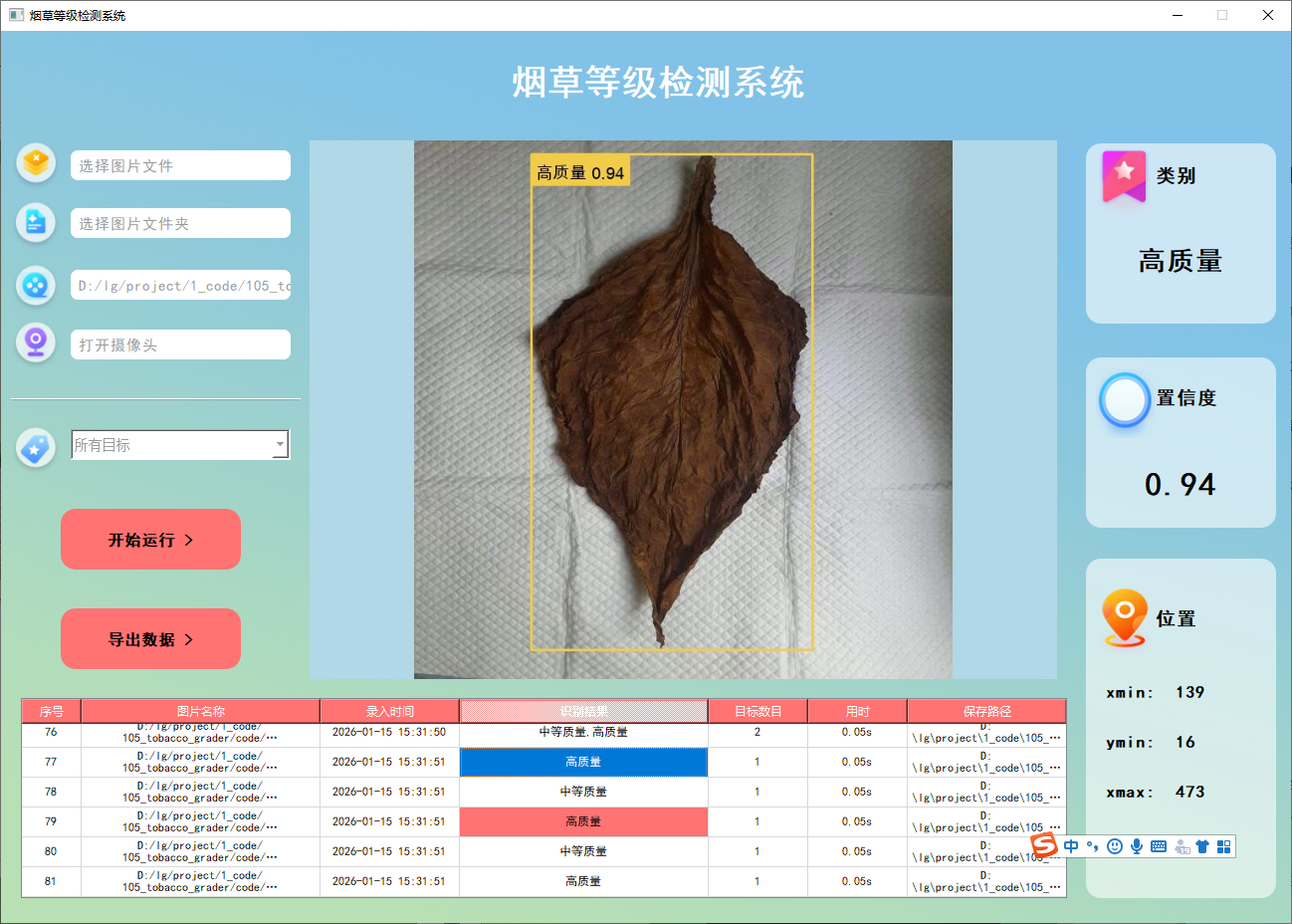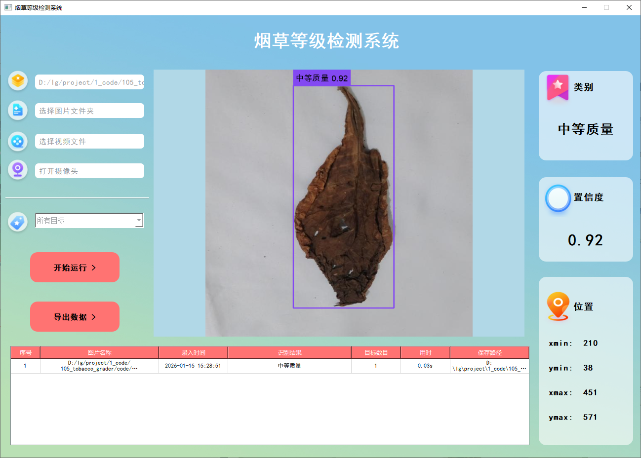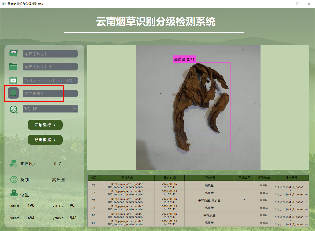 此外,我们开发了一款带有UI界面的烟草识别分级识别系统,支持实时检测烟草,并能够直观地展示检测结果。系统采用Python与PyQt5开发,可以对图片、视频及摄像头输入进行目标检测,同时支持检测结果的保存。本文还提供了完整的Python代码和详细的使用指南,供有兴趣的读者学习参考。获取完整代码资源,请参见文章末尾。