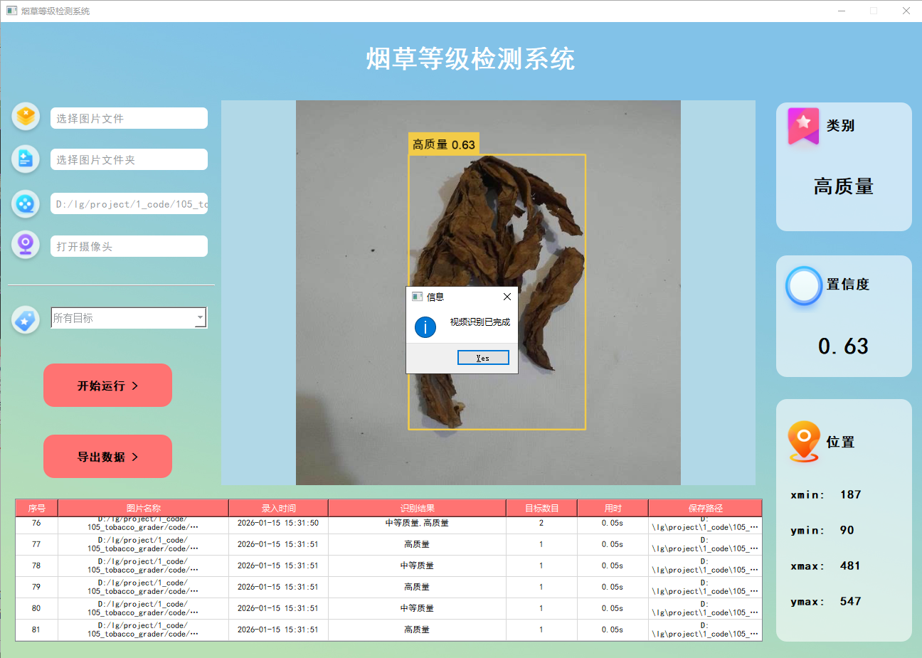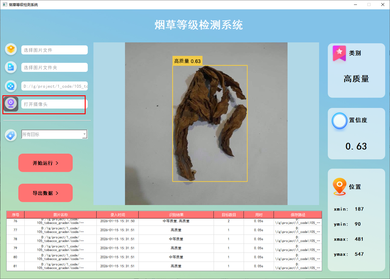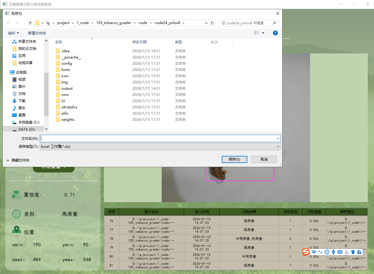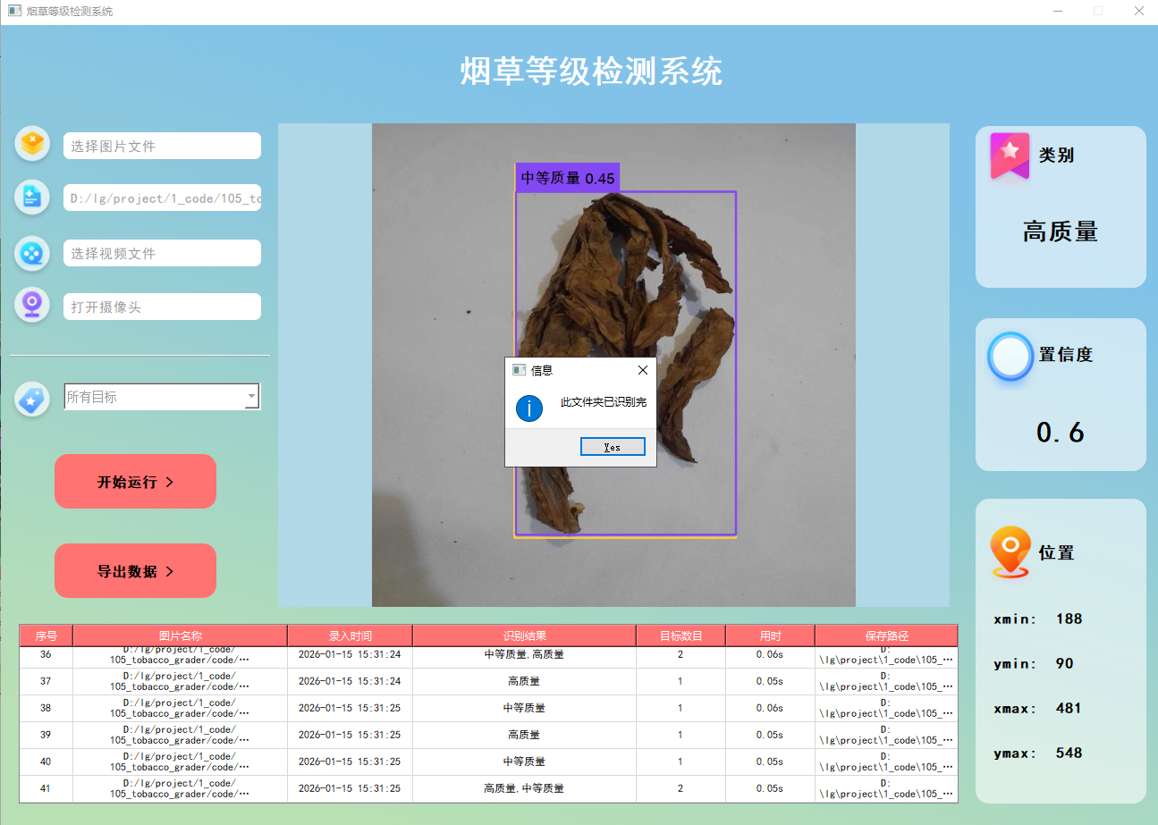 此外,我们开发了一款带有UI界面的烟草识别分级识别系统,支持实时检测烟草,并能够直观地展示检测结果。系统采用Python与PyQt5开发,可以对图片、视频及摄像头输入进行目标检测,同时支持检测结果的保存。本文还提供了完整的Python代码和详细的使用指南,供有兴趣的读者学习参考。获取完整代码资源,请参见文章末尾。