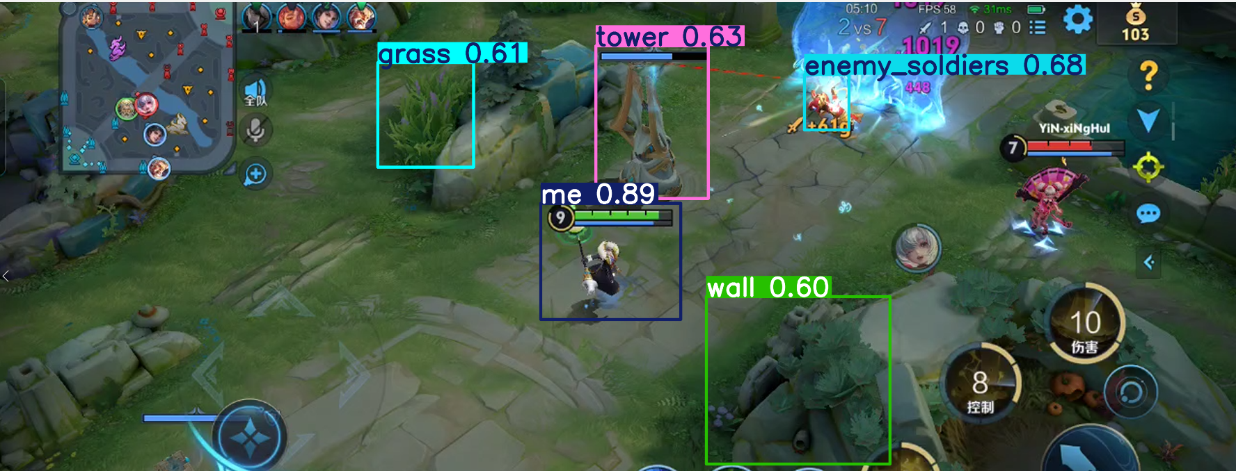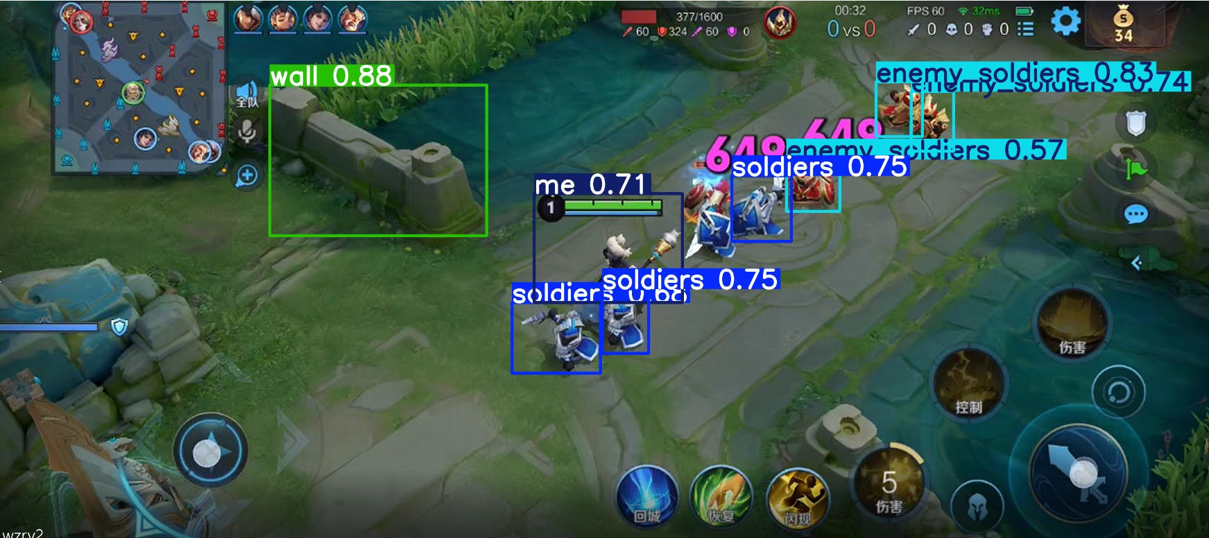 下面是用了30张样张训练的效果,已经能够识别基础对象了,但对于全英雄识别,这个工作量是巨大的需要上千张样张,和上百个游戏视频。