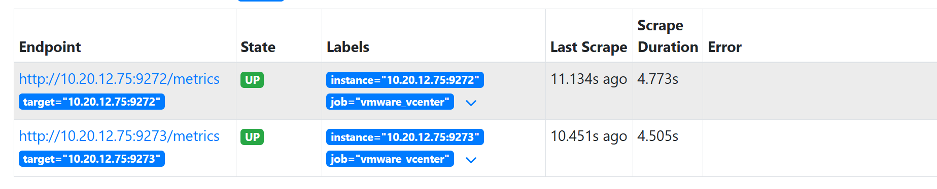 Prometheus Targets 页面应看到 vmware_exporter 处于 UP 状态