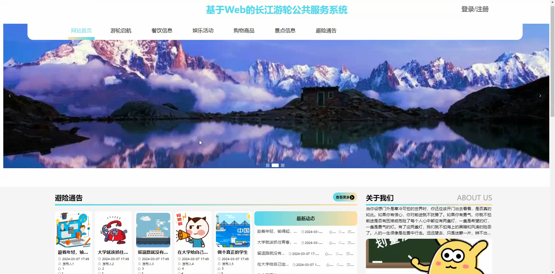 核心功能:游轮班次与舱位查询/在线预订/支付、电子票务、岸上观光项目介绍与预订、长江旅游资讯发布、航道天气与水文信息实时展示、游客社区与评价分享。