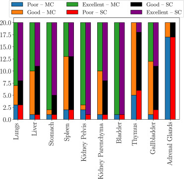 图5.每个标签和分割网络的中位数评分计数;MC:多通道网络;SC:单通道网络。差------需要修正50%以上;好------需要修正约25%;优秀------几乎不需要修正(小于5%)。当评分者被问及标签网络偏好时,16/20的病例标签图被认为是相同的,4/20的病例评分者更偏好多通道网络生成的标签。