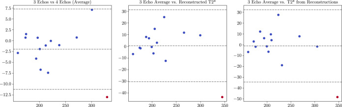 图7.Bland-Altman图比较使用不同方法确定的平均T2*肺值。左图:比较来自三回波拟合和四回波拟合(均在原始未重建图像上进行)的五个动态的平均胎儿肺T2*测量值;中图:比较平均三回波胎儿肺T2*值和重建的T2*胎儿肺值(如Payette等人(2023)所述);右图:比较平均三回波胎儿肺T2*值和来自三回波拟合的平均T2*值。蓝色:在2个标准差范围内的点;红色:超出2个标准差的点。