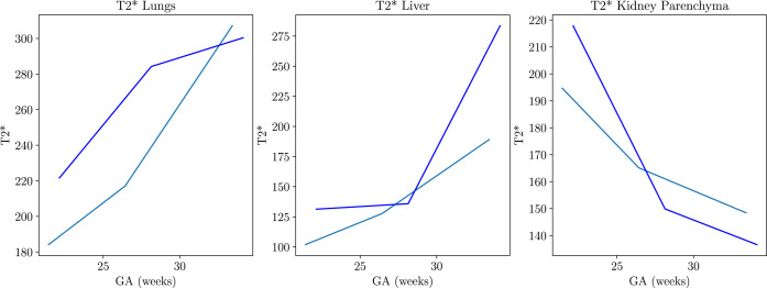 图10.两名具有三个扫描时间点的受试者的肺、肝脏和肾实质的平均T2*曲线。
