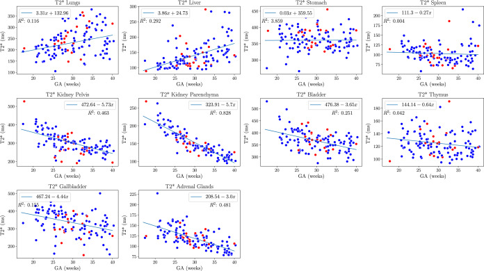 图8.此处显示了对照组病例(蓝色)和病理组病例(红色)的十个器官的平均T2*生长曲线。所有拟合仅在对照组病例上进行。平均T2*拟合的R2值如下:肺:0.116;肝脏:0.292;胃:3.859;脾脏:0.004;肾盂:0.463;肾实质:0.828;膀胱:0.251;胸腺:0.042;胆囊:0.155;肾上腺:0.481。病理病例是多种病理的混合,如表1所示,无法进行统计分析。