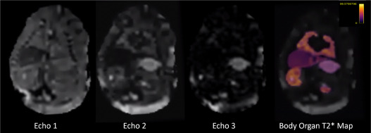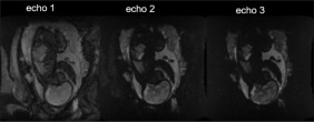 图2.使用多回波梯度回波序列采集的单个动态图像的三个回波演示。