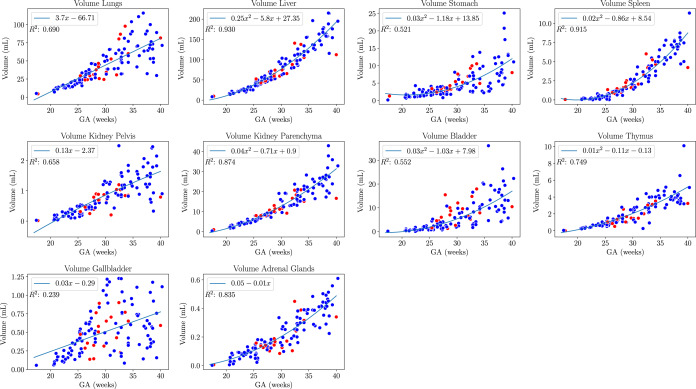 图9.此处显示了FOREST流程获得的十个胎儿身体器官的体积生长曲线,包括对照组病例(蓝色)和病理组病例(红色)。所有拟合仅在对照组受试者上进行。平均T2*拟合的R2值如下:肺:0.690;肝脏:0.930;胃:0.521;脾脏:0.915;肾盂:0.657;肾实质:0.874;膀胱:0.552;胸腺:0.749;胆囊:0.239;肾上腺:0.835。所有器官体积都与胎龄呈强相关。除胆囊外,所有器官均呈二次增长。