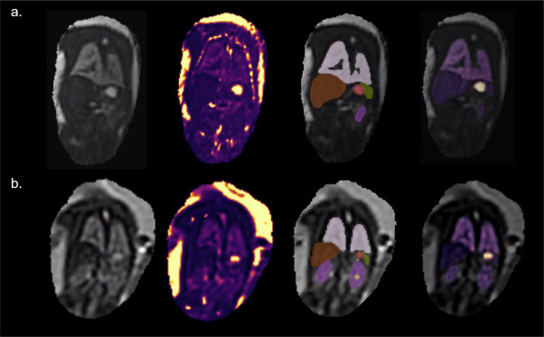 图6.从左到右:第二个回波的胎儿可变形切片到体素重建(dSVR)示例;T2*图dSVR(使用"地狱"色图显示,从深蓝色(0 ms)到亮黄色(1000 ms));多通道网络生成的标签图;叠加在第二个回波3D体积重建上的器官T2*图。上排:胎龄35.71周,下排:胎龄23.14周。