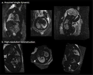 图4.上排(a):重建前单个有运动伪影的动态图像示例。请注意左侧和中间图像中可见的切片之间的运动伪影;下排(b):同一病例在所有三个平面上重建后的3D体积,运动伪影已消除。