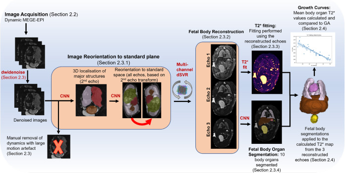 图1.低场下定量T2*胎儿身体MRI和分割的完整FOREST流程(从左到右)。图像采集后,图像经过去噪处理,使用卷积神经网络(CNN)分割胎儿身体,然后分割主要器官(肺、心脏、肝脏、腹部)以将胎儿身体重新定向到标准空间。接下来,对每个采集到的回波进行可变形切片到体素重建(dSVR),然后使用所有三个重建回波进行T2*拟合,并分割成十个胎儿身体器官。计算每个器官的平均T2*值并与胎龄(GA)进行比较。