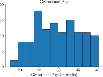 图3.本研究中纳入的120名多回波多梯度动态序列参与者的胎龄直方图。7个排除病例中有6个胎龄小于等于20.0周,其余1个排除病例为23.6周胎龄。