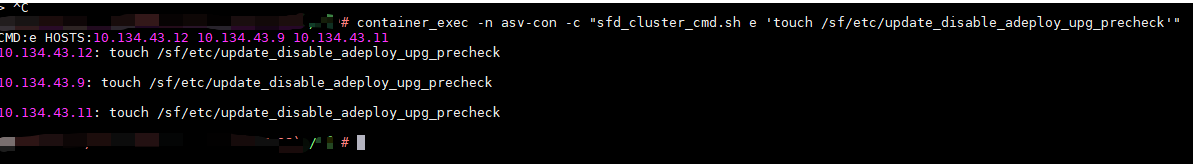 在一个项目中,需要进入环境后台执行一个SSH命令:container_exec -n asv-con -c "sfd_cluster_cmd.sh e 'touch /sf/etc/update_disable_adeploy_upg_precheck'" (类似进入容器中执行配置修改操作),如果人为进入环境后台执行,是有交互输出的,如下图,但是如果使用 paramiko 封装的SSH client 执行这个命令,就报错提示:execing command in container: input is not a terminal