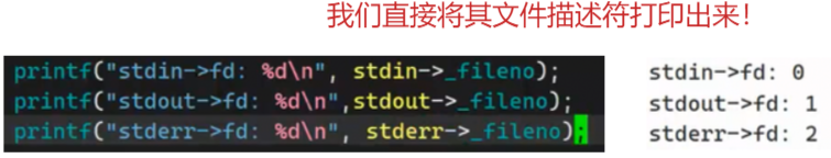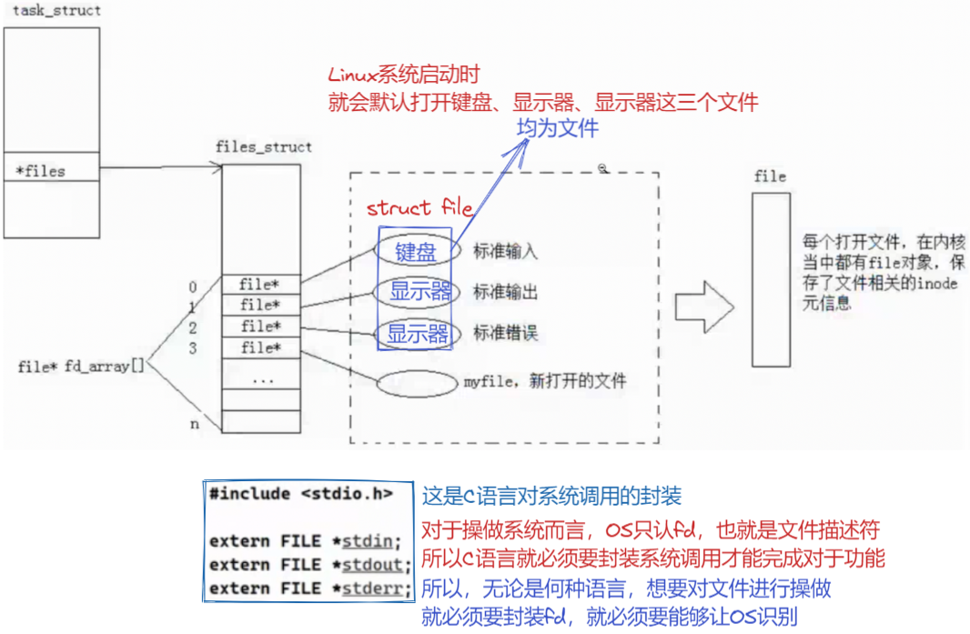 所以,我们不妨大胆推测,再C语言中的FILE结构体,实现输入输出操做时,在结构体中也封装0、1、2这样的文件描述符!