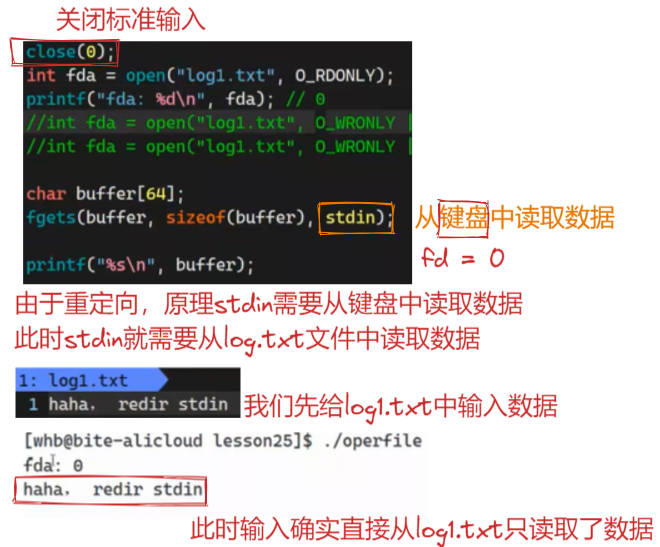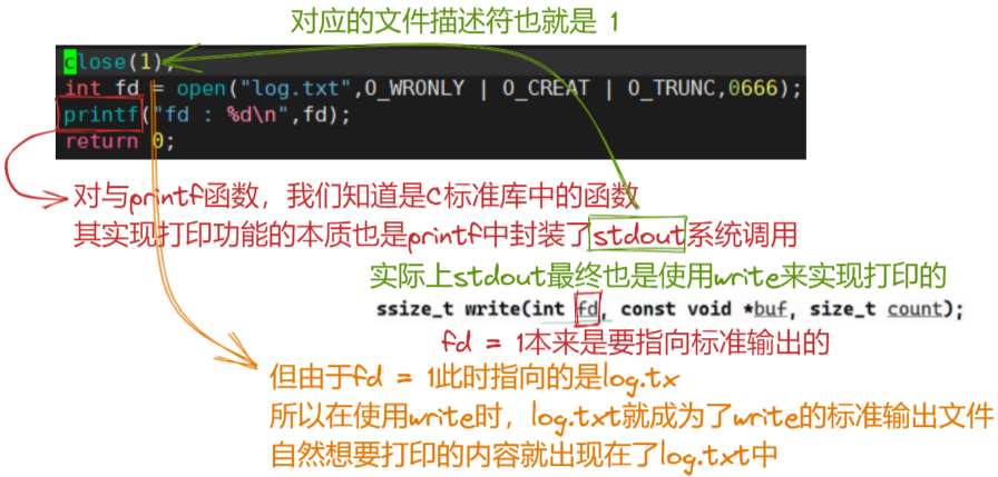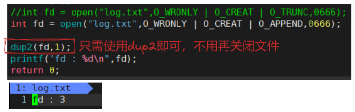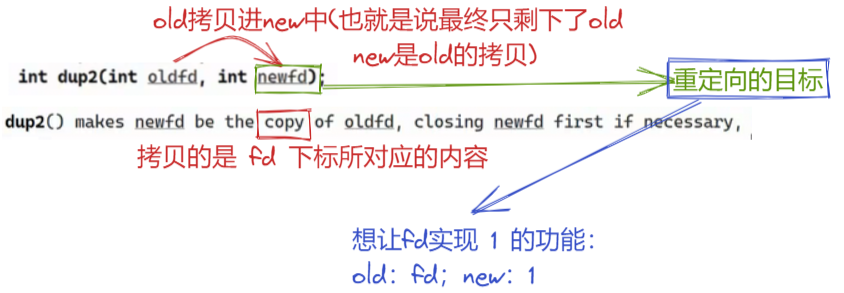 我们知道重定向的本质,就是在代码层,功能的实现只看对应的fd也就是文件标识符的值,而不在意该文件标识符指向的内容,所以我们是否可以通过改变标准文件标识符所对应的文件内容来实现重定向功能呢?也就是说,将我们自己的文件 log.txt 的地址拷贝复制到标准文件标识符中,此时就可以实现重定向功能了