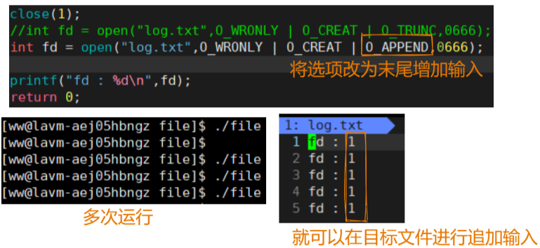 所以,当我们再给open添加选项:O_APPEND就会在文件原内容的基础上往后添加新的内容了