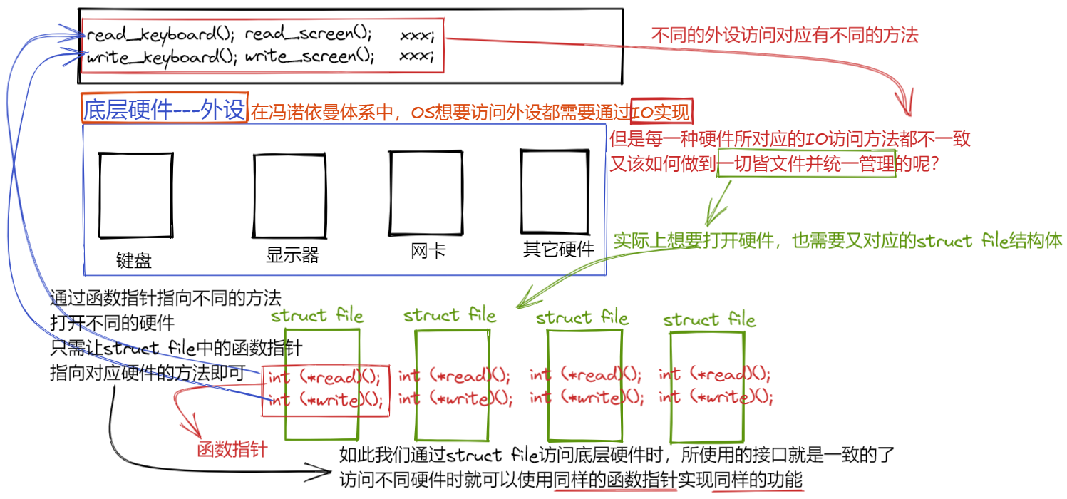 也就是说,Linux通过struct file将不同的硬件使用同样的接口联系在了一起,也就可以通过struct file文件访问到硬件!在进程层面,只看到了同样的struct file文件,通过文件可以访问硬件,所以,对进程来说,Linux下一切皆文件