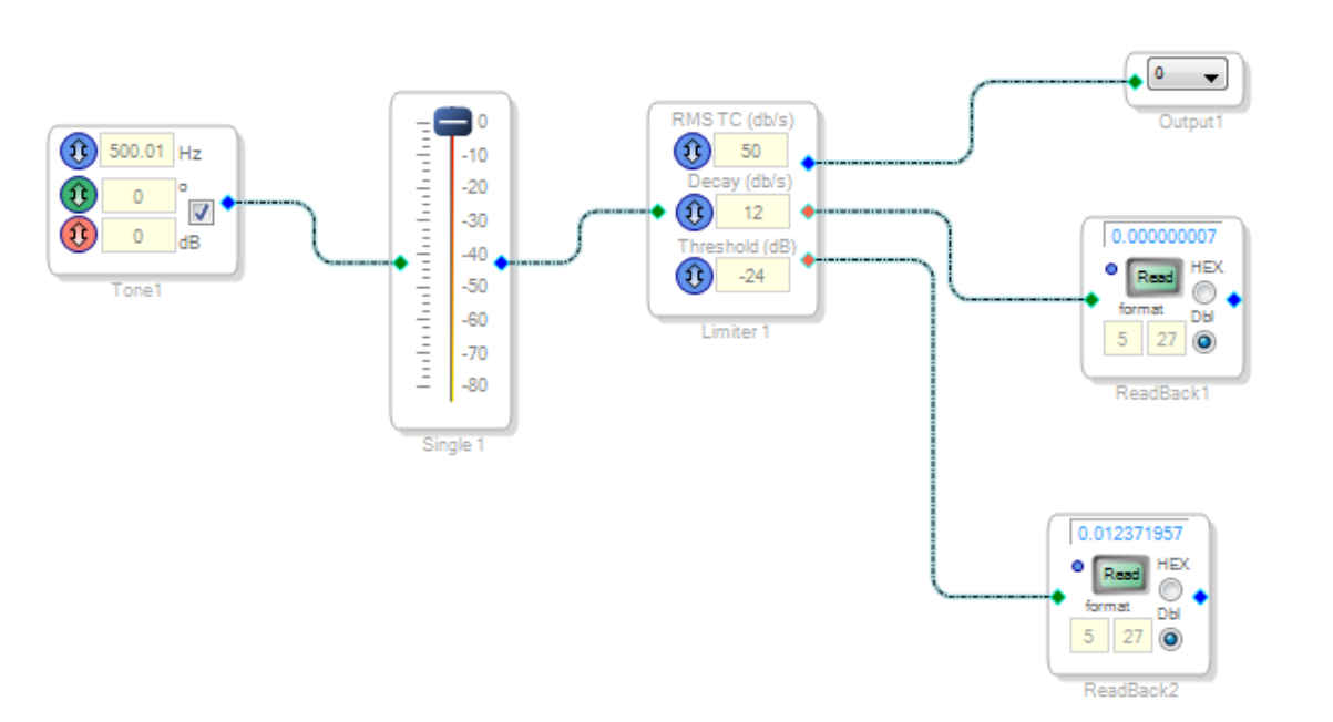 该设计采用 "信号音 (查找/正弦)"(Tone (lookup/sine))模块、"单音量 (共享)"(Single Vol (shared))模块、"限幅器" (Limiter)、" DSP 回读" (DSP Readback)模块、"端子" (Terminal)和输出模块。其中,输入信号的阈值点设为-24 dB,当输入的均方根值超过该值时,则依据"限幅器"帮助页面上给出的比例降低增益。