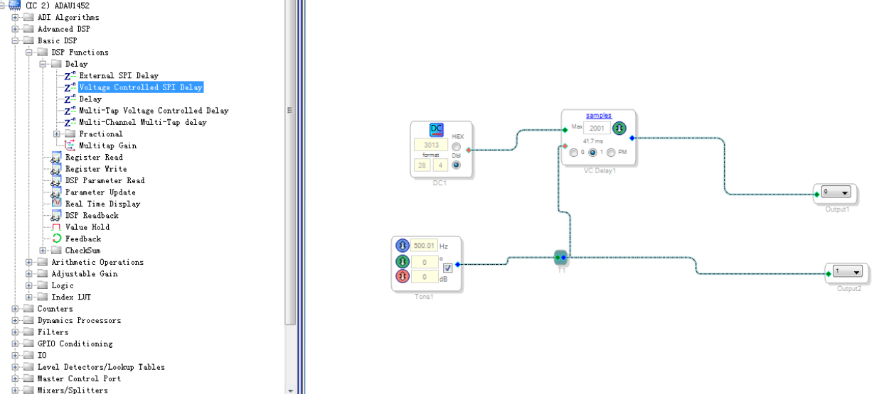 ADAU1452 的进阶例程 5:DC Input 和 Tone (lookup/sine)和 Voltage-Controlled Delay 模块的组合使用