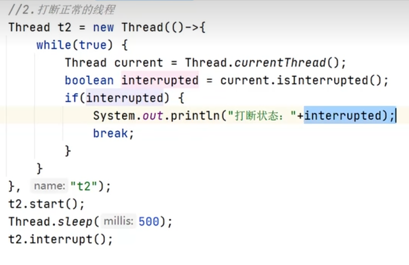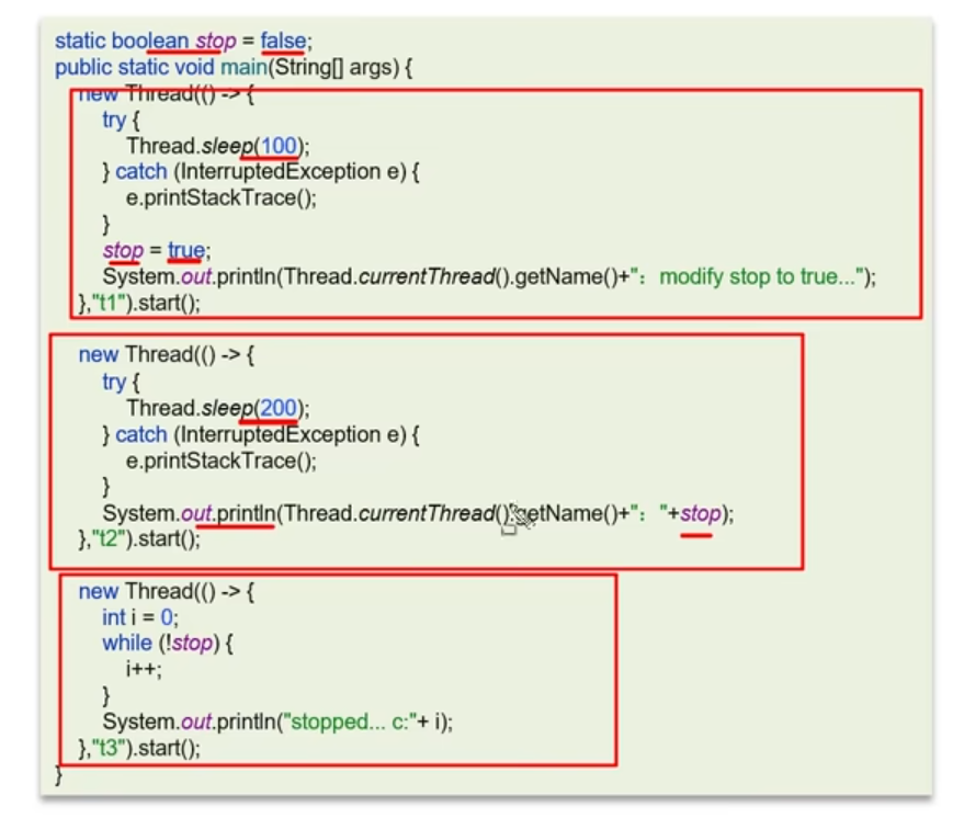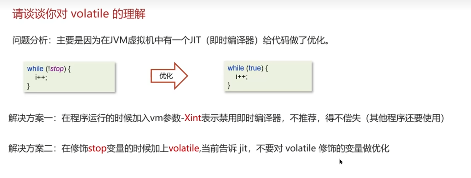 用volatile修饰共享变量,能够防止编译器等优化发生,让一个线程对共享变量的修改对另一个线程可见;(针对JIT自动优化的情况;其余简单情况、不加volatile、比如这里线程2也能读到stop=true)