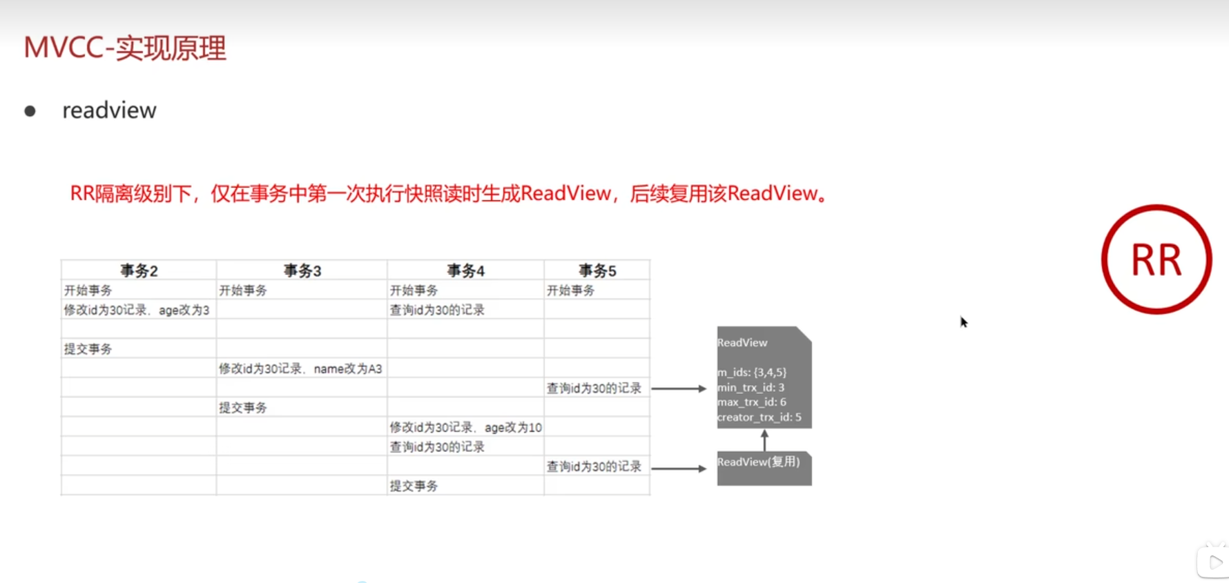 RR是可重复读、每次查询都用最开始的readview;