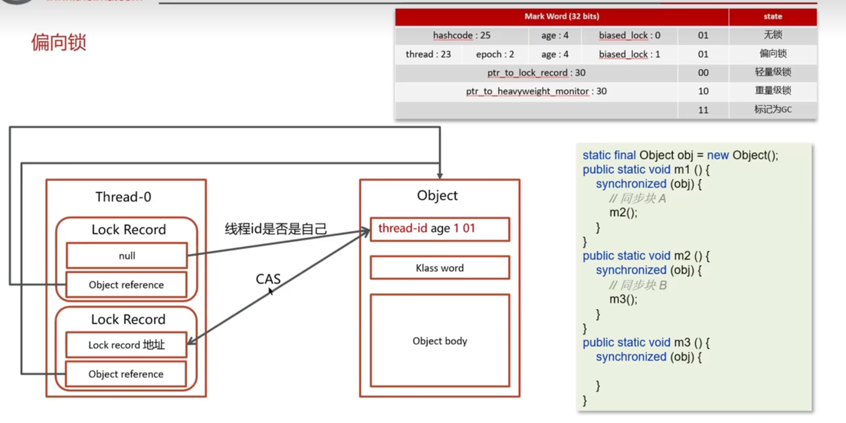 只做一次CAS操作、把线程id记录、biased_lock设置1;后续不做CAS操作、只比对线程id即可;