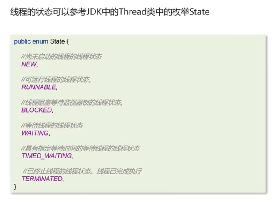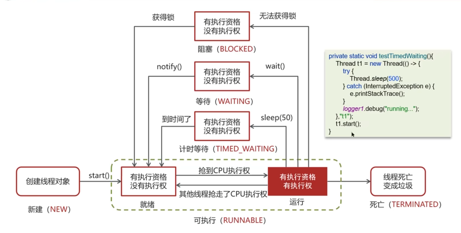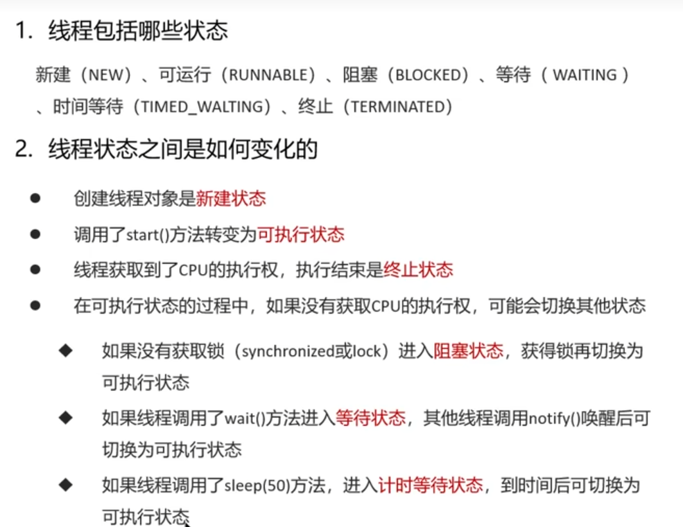 等待状态、就是当前线程获取到锁后、执行到里面的wait()、此时释放锁;其它线程获取锁、然后通知notify()、当当前线程再次获取到锁时、然后执行后续方法;