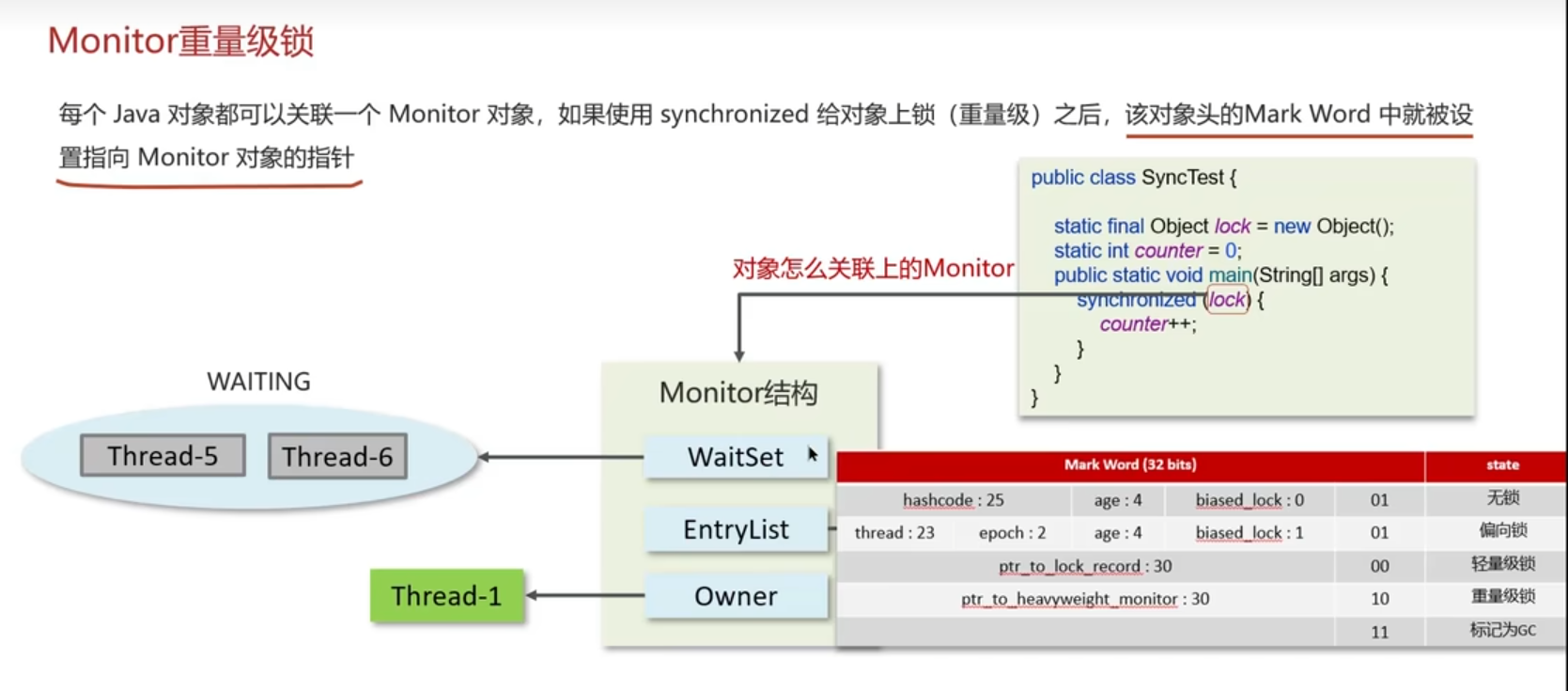 每个Java对象都可以关联一个Monitor 对象,如果使用synchronized给对象上锁(重量级)之后,该对象头的Mark Word 中就被设置指向Monitor对象的指针;