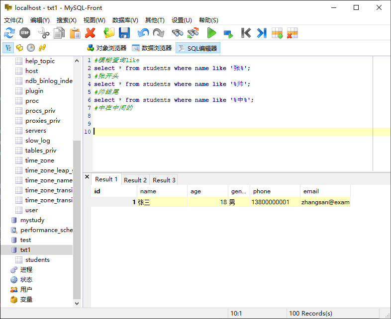 (1, '张三', 18, '男', '13800000001', 'zhangsan@example.com'),