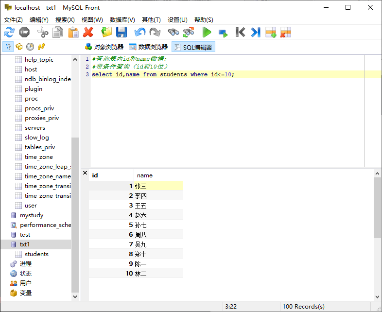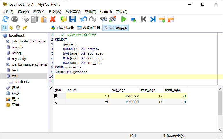 (10, '林二', 21, '女', '13800000010', 'liner@example.com'),