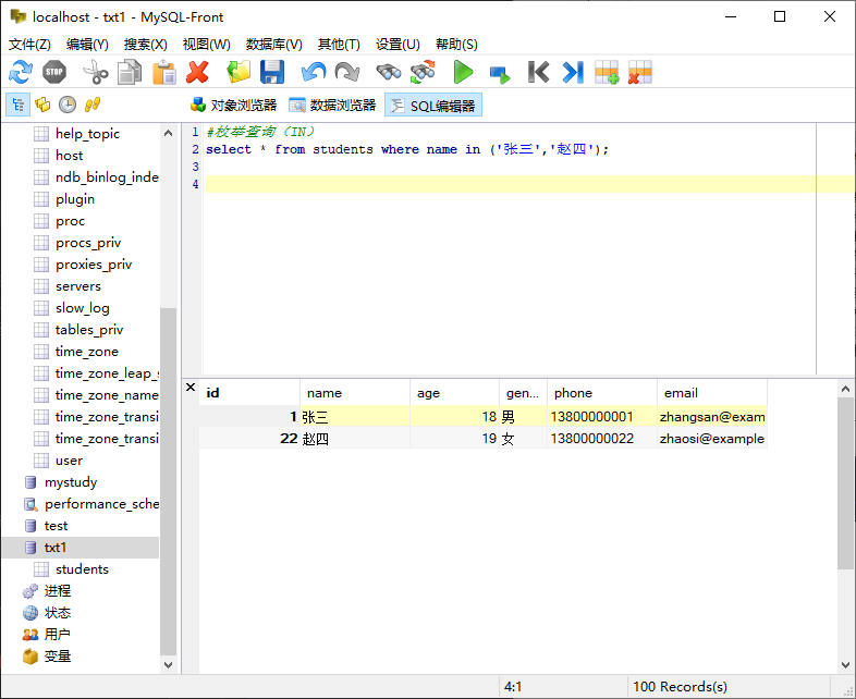 (22, '赵四', 19, '女', '13800000022', 'zhaosi@example.com'),