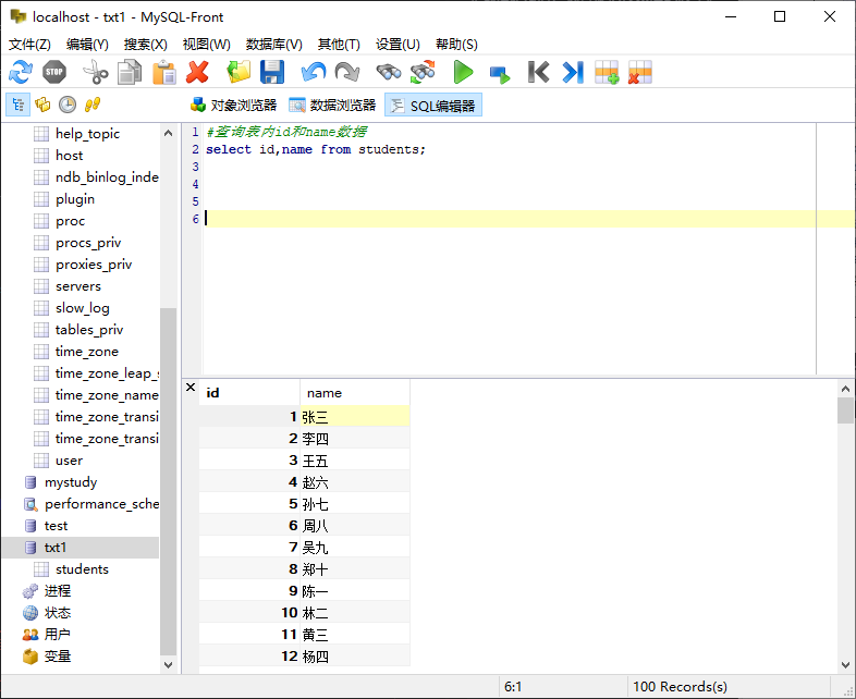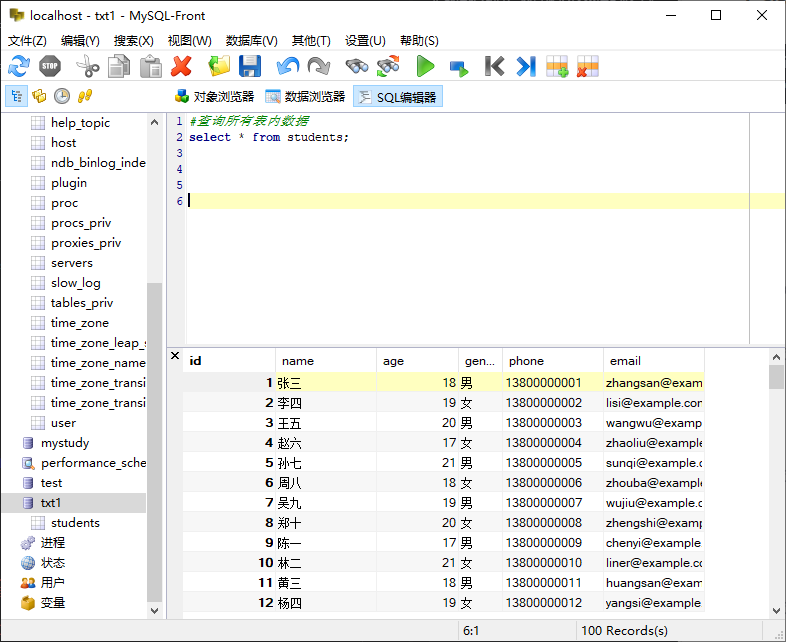 (14, '孙六', 17, '女', '13800000014', 'sunliu@example.com'),