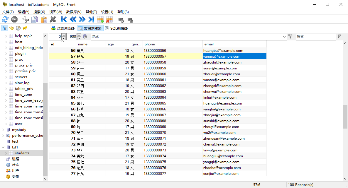 (12, '杨四', 19, '女', '13800000012', 'yangsi@example.com'),