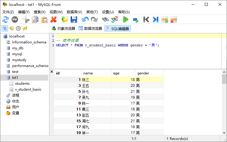 (9, '陈一', 17, '男', '13800000009', 'chenyi@example.com'),