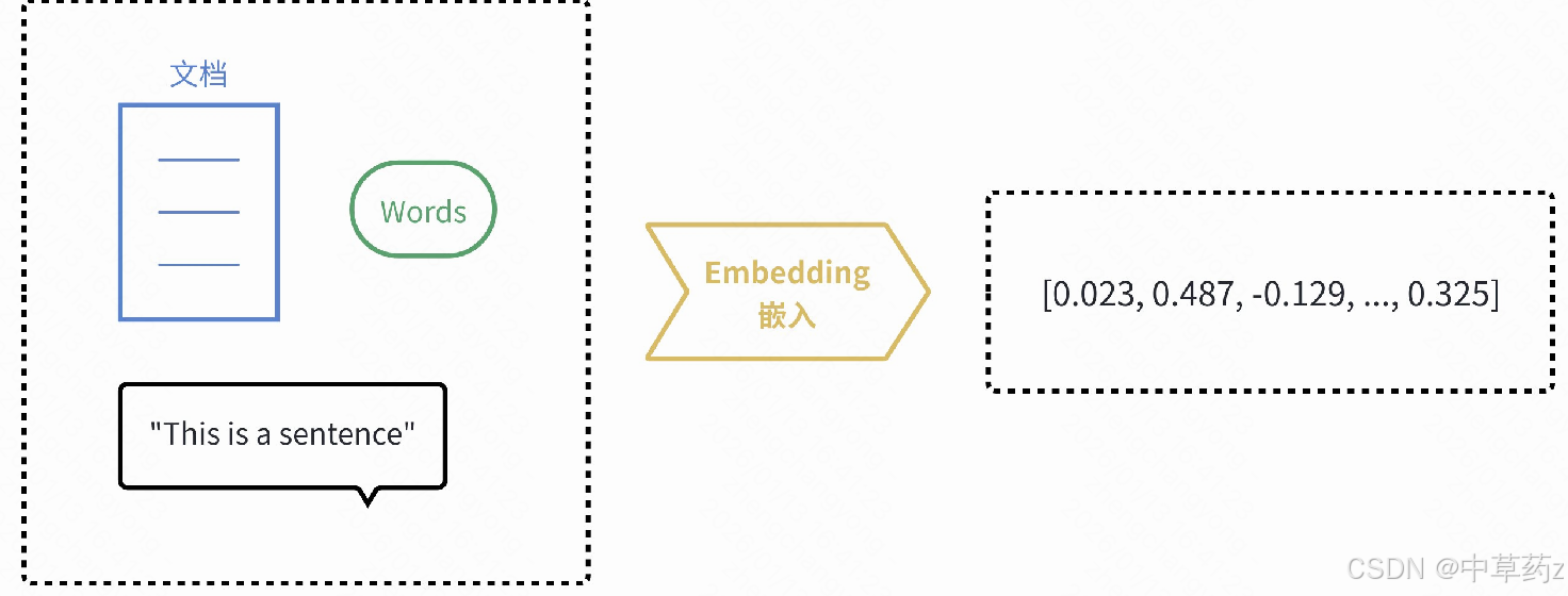 在 AI 领域,会通过模型(比如 Word2Vec、BERT)把文本、图像等带语义的对象,转换成向量(一组有序的数字),这个过程叫语义向量化。比如: